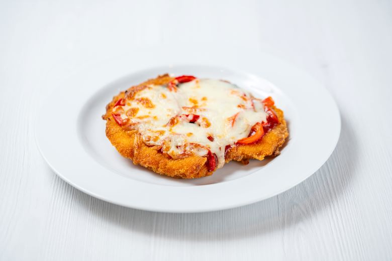 șnițel din ceafă porc, sos roșii, gogosari, măsline, gratinat
